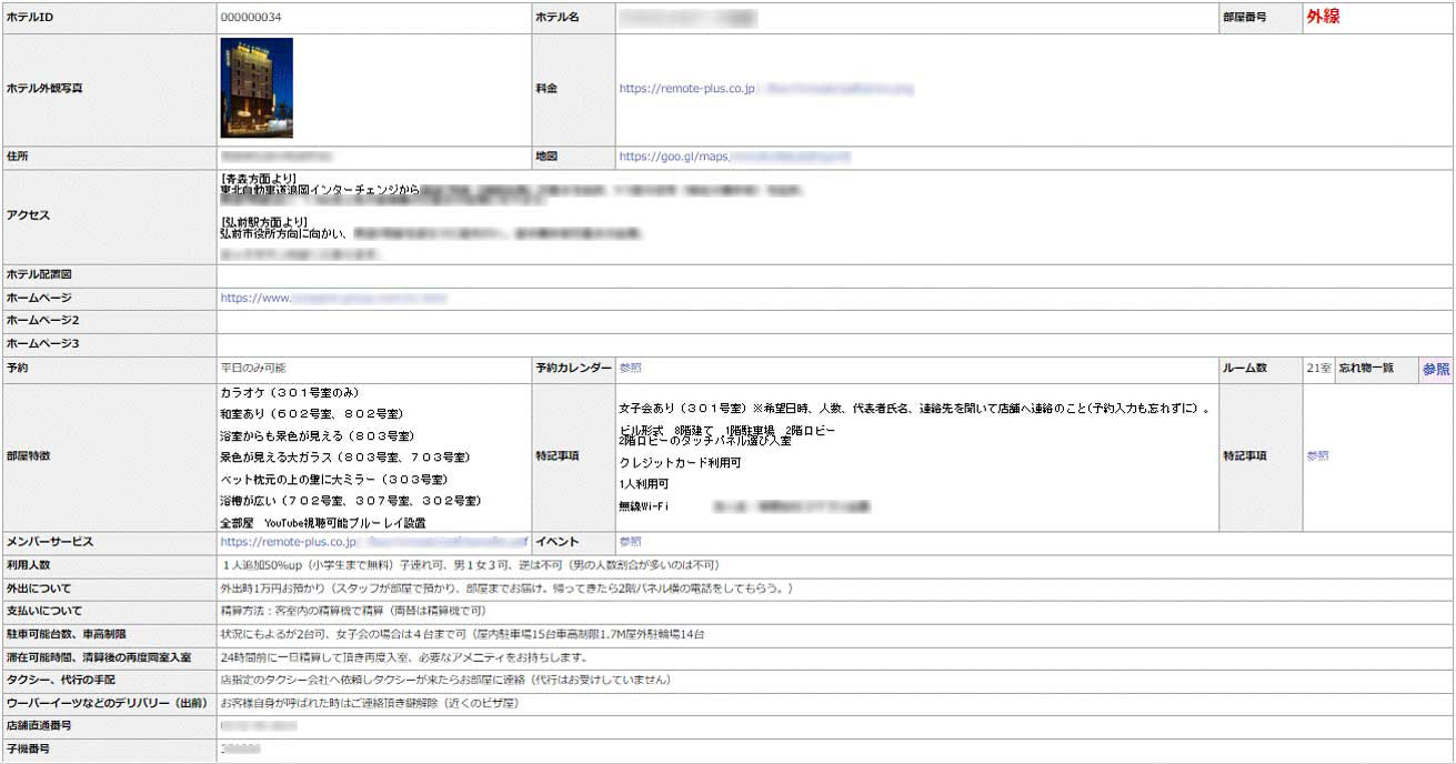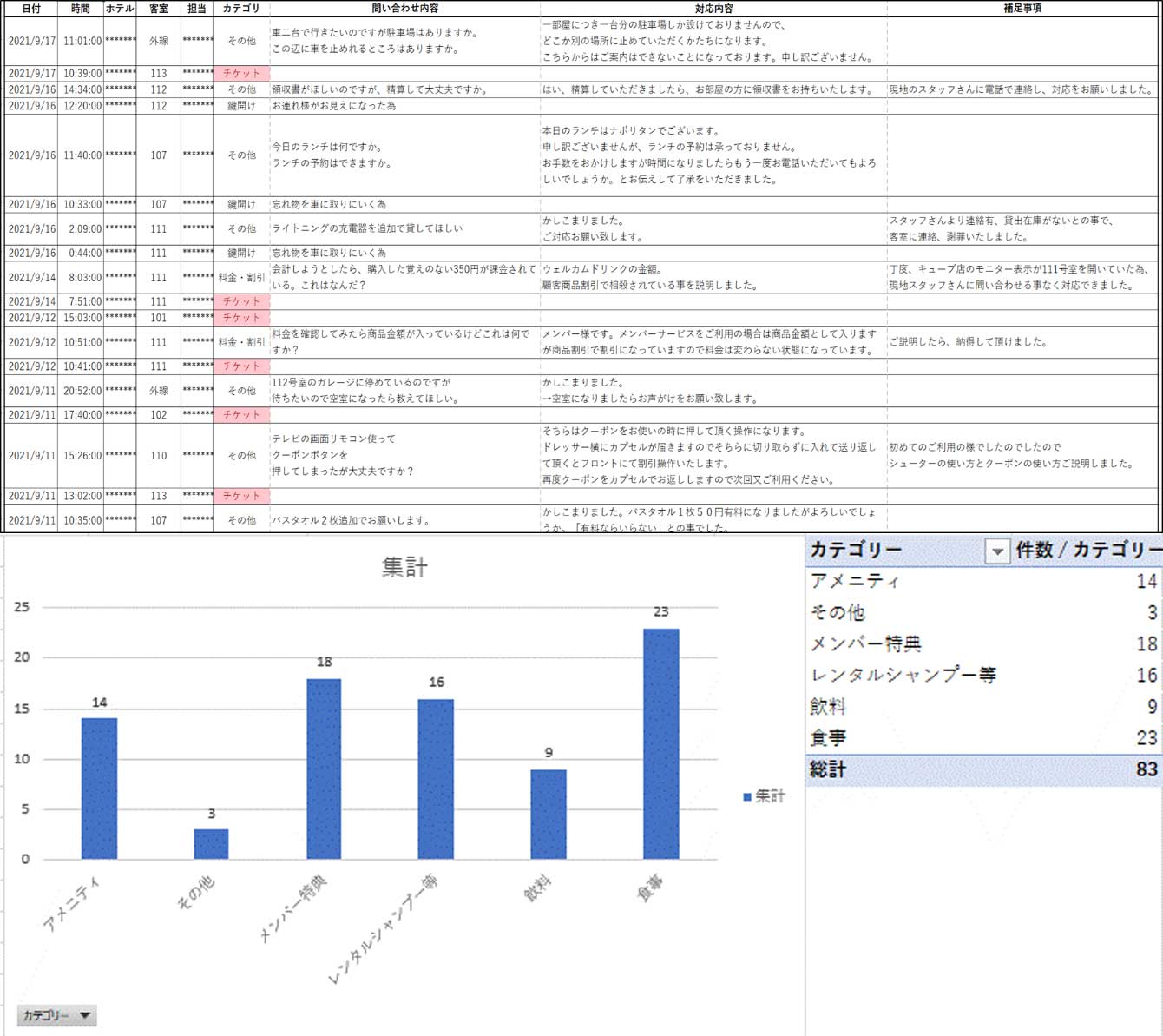 施設への着信・客室からの発信にURLを結びつけ(CTI連携)、PCに必要な情報が自動でポップアップします。外線では「ホテルへの道順」「空室状況」「料金システム」「予約確認」「忘れ物」といったお問合せ内容が確認できます。